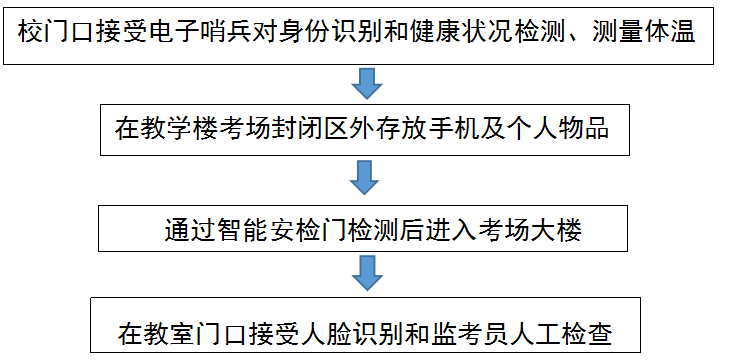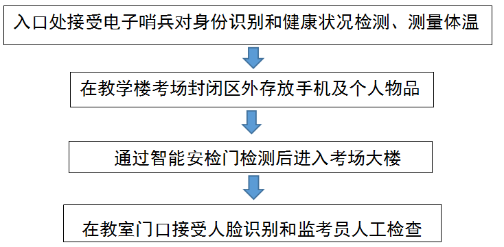 所有考生要求佩戴医用外科口罩或以上级别的口罩,逐一查验核酸检测结果、健康码绿码、检测体温,有序进入校园,并按指定路线到达教学楼等候。