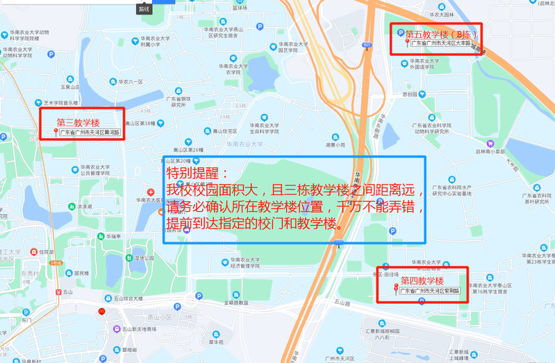 根据疫情防控要求和考场位置,考试期间,在第三教学大楼考试的考生,由学校西南门(靠近五山地铁A口)进校;在第四教学大楼考试的考生由学?;憔氨泵沤#ǖ己降交憔靶鲁潜泵呕蚧憔氨甭饭徽荆?/span>;在第五教学大楼考试的考生由东北门进校(导航到“华农大东北门(公交站)”)。