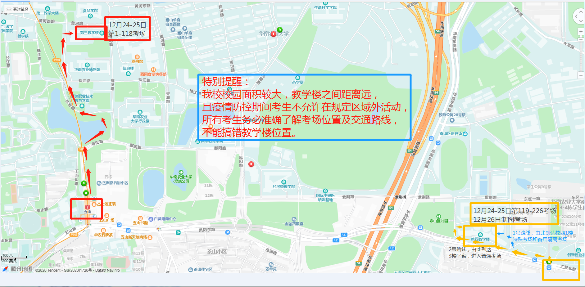 12月24-25日在第三教学大楼考试的校外考生:沿华南农大西南门(五山地铁A口)入校,沿指定路线到第三教学大楼,步行约需10分钟。